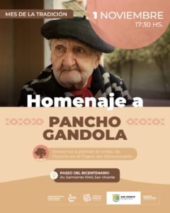 El próximo sábado 1 de noviembre desde las 17:30 horas en el Paseo del Bicentenario, ubicado en Avenida Sarmiento 1040 de San Vicente, el Municipio celebrará el Mes de la Tradición con una jornada especial que incluirá un homenaje al recordado Pancho Gandola y un encuentro de payadores con destacados artistas locales y regionales.