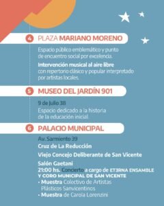 Luego, los visitantes podrán acercarse al Museo del Jardín 901 y al Palacio Municipal, donde se realizará un concierto a cargo de Eterna Ensamble y el Coro Municipal de San Vicente, además de muestras de artistas plásticos sanvicentinos y de Carola Lorenzini.