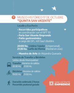 El cierre será en el Museo Histórico 17 de Octubre “Quinta San Vicente”, con recorridos participativos, la Feria San Vicente Emprende, patio gastronómico y presentaciones de Cristina Tejedor y Garfio de Momia. También se podrá disfrutar de una muestra de arte de Alejandra Quesada.